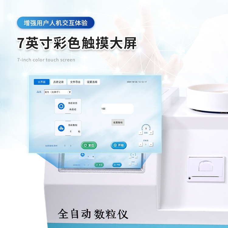 简要描述: 全自动多功能数粒仪IN-SL01显示方式:7寸彩色触摸屏,增强用户人机交互体验;预值设置:可预先设置数粒值,当数粒达到所设值时,自动停止工作;当无预值设置时,数粒仪可一直工作直至数完振动盘内种子;自定义品种:可以在设置页面自定义需要数粒的品种名称,振动速度等;数据记录:对所测数据可进行自动记录和保存。